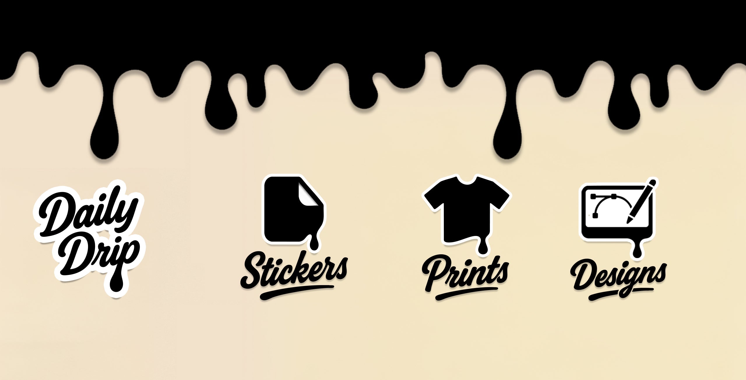 Logo with text 'Daily Drip' and icons for stickers, prints, and designs on a beige background.