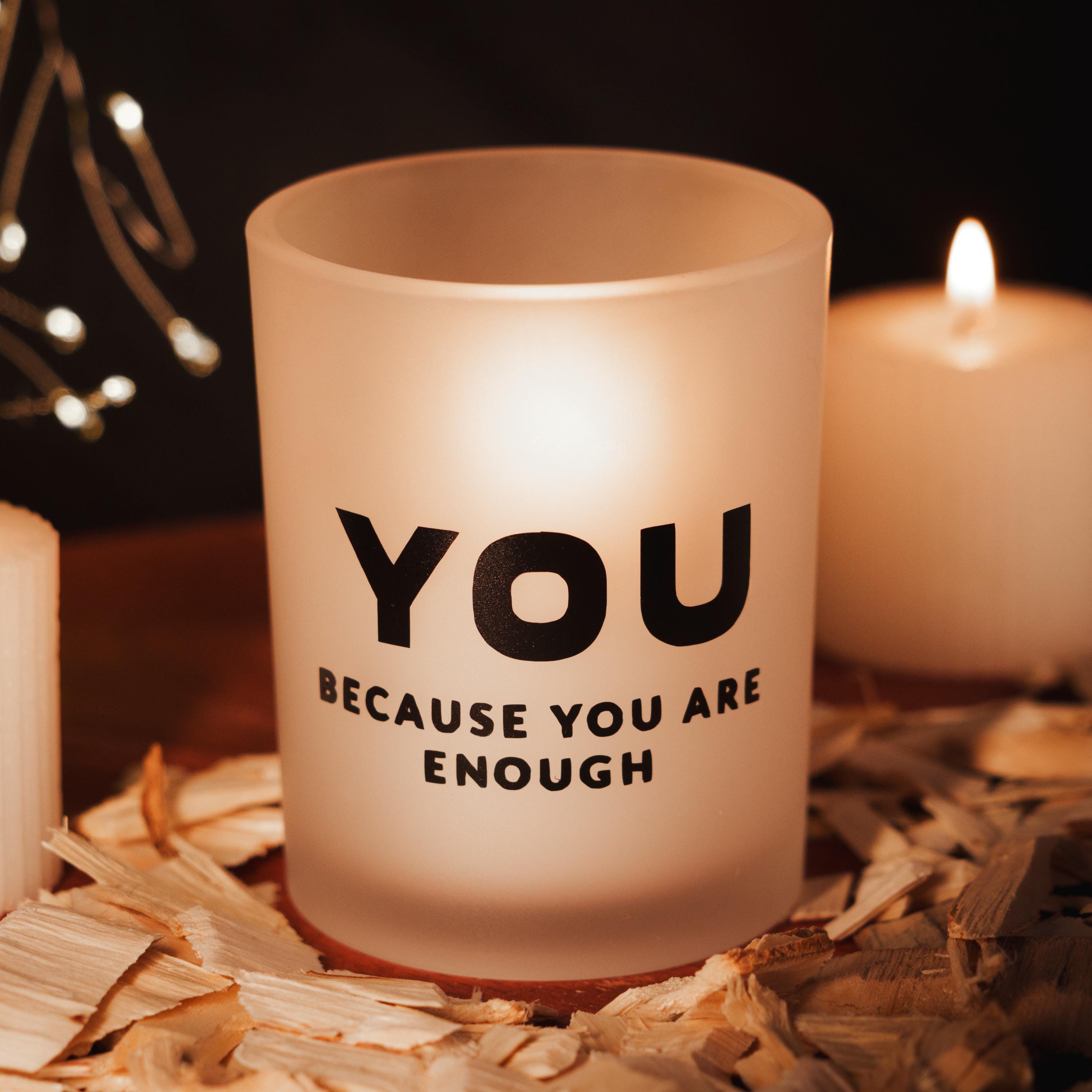 A minimalist frosted glass candle jar designed to remind you — or someone you love — that you are already enough.